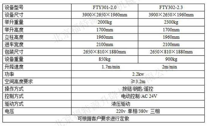 液壓雙油缸驅動,載重2噸,2.3噸,空間高度滿足3.2米即可使用