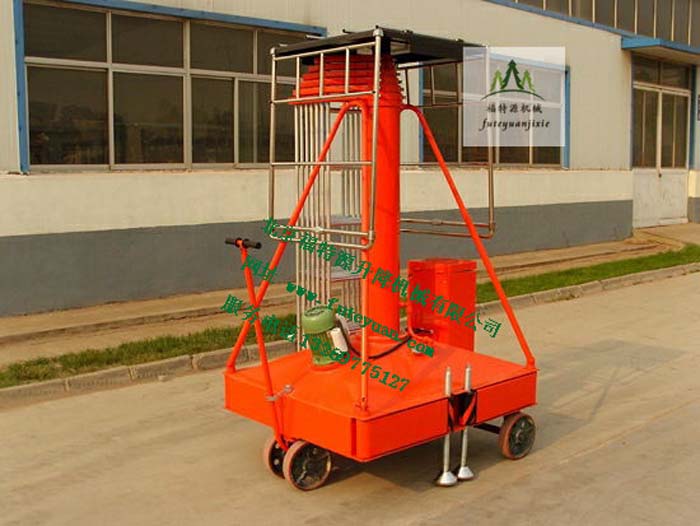 該產品是一種多用途的單作用伸縮式套簡油缸組成的垂直升降機械。可廣泛用于車站、碼頭、賓館大廳、車間等高空作業的場合。整機設計結構緊湊、晃動小、重量輕、移動方便等特點,是登高作業安全,經濟實用的機具。